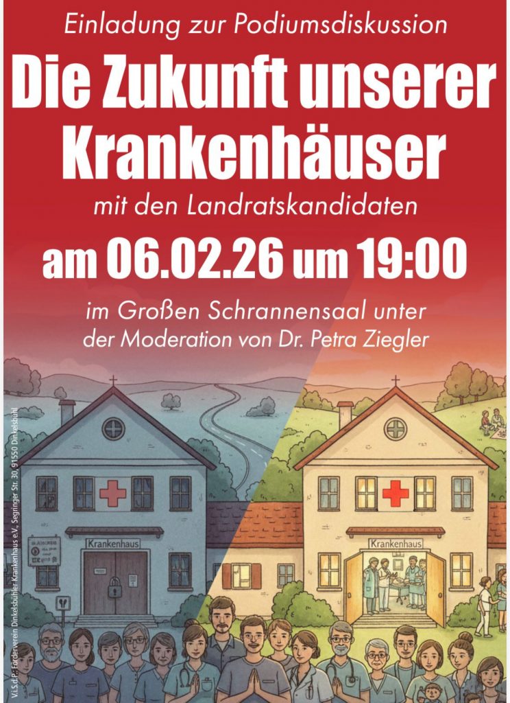 am 06.02. findet in Dinkelsbühl im Großen Schrannensaal eine Podiumsdiskussion statt, in dem um die Gesundheitsversorgung im Landkreis Ansbach geht.